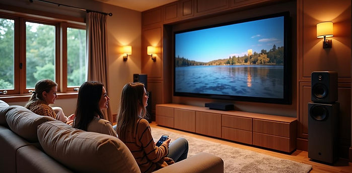 This is a 65" TV mounted over the FirePlace. Also shown are the flush-mount, in-ceiling speakers and the AV equipment in the cabinet on the right. Controlled by Samsung's simple remote control and by an App on the SmartPhone.